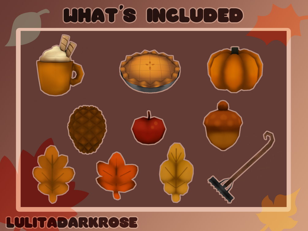 You'll get 14 .vtpa files of Fall/Autumn themed Vtuber throwable items such as: 3 tipes of leaves, apple, acorn, cocoa mug, apple pie, pumpkin and a rake!